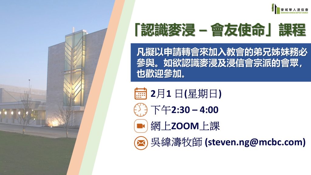 • 日期:2月1日 (星期日) • 時間:下午2:30-4:00 • 地點:網上ZOOM上課 • 查詢及報名:吳緯濤牧師 (steven.ng@mcbc.com) 凡擬以申請轉會來加入教會的弟兄姊妹務必參與。如欲認識麥浸及浸信會宗派的會眾,也歡迎參加。