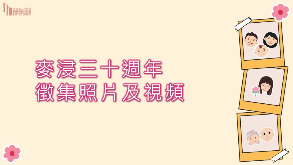 為了慶祝麥浸30週年,教會邀請弟兄姊妹上傳照片及視頻,分享你們在教會的回憶及經歷。請點擊以下鏈結查看更多詳情: