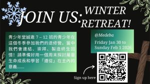 青少年退修營現正接受報名!一年一度的青少年退修營將會在2026年1月30日至2月1日在Medeba舉行。本年度的主題是「遵從」,研讀約翰福音15:1-8。 晨鳥優惠 (12月15日前):$220 正價...