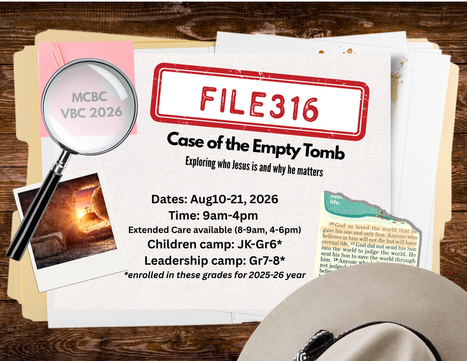 今年,麥浸 將為 2025 年 9 月至 2026 年 6 月學年就讀 JK 至 8 年級的兒童 舉辦 暑期聖經營(VBC)。同時,我們也將開辦 LIT(Leaders-in-Training)領袖培訓計劃,旨在培訓青少年(7 至 8 年級),裝備他們領導能力與生活技能,並透過與年幼營員實際互動,獲得寶貴而實用的領導經驗。 今年營會的主題是 《檔案 316:空墳墓之謎》。營員將一同探索耶穌是誰,以及祂為何如此重要。