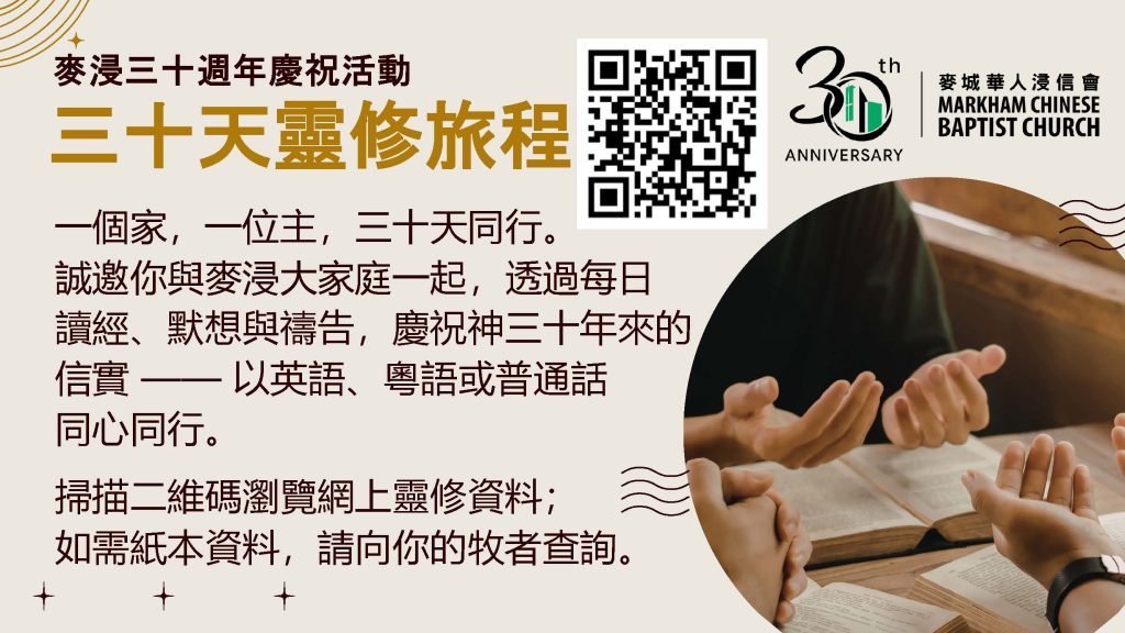 一個家,一位主,三十天同行。誠邀你與麥浸大家庭一起,透過每日讀經、默想與禱告,