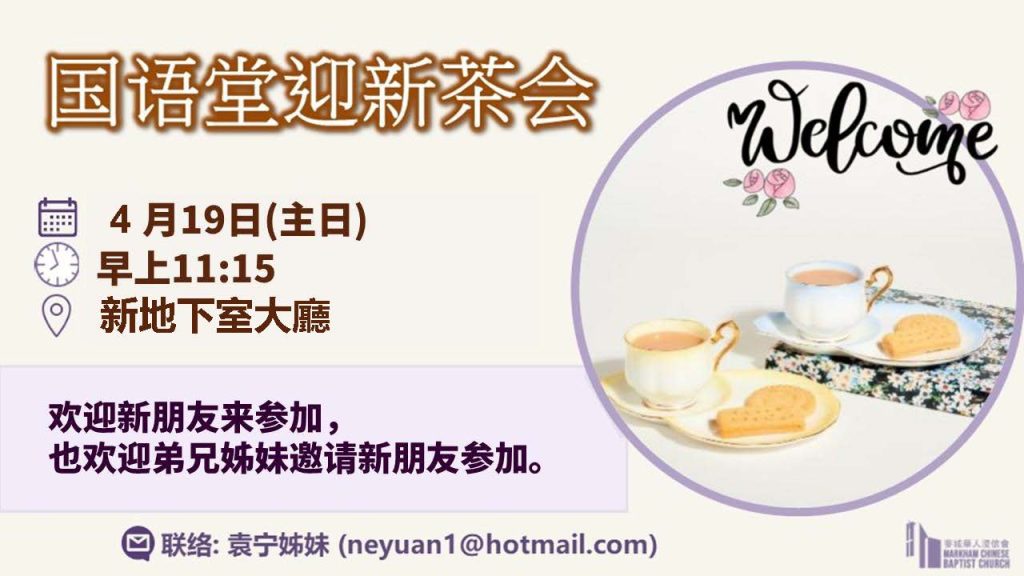 聯絡人:袁寧姊妹neyuan1@hotmail.com 歡迎新朋友來參加,也歡迎弟兄姊妹邀請新朋友參加。