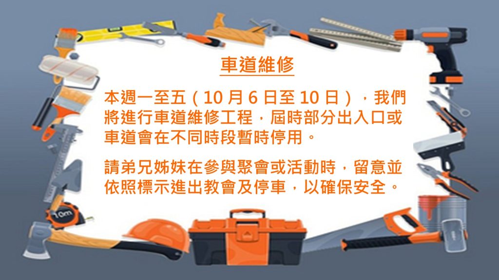 請弟兄姊妹在參與聚會或活動時,留意並依照標示進出教會及停車,以確保安全。