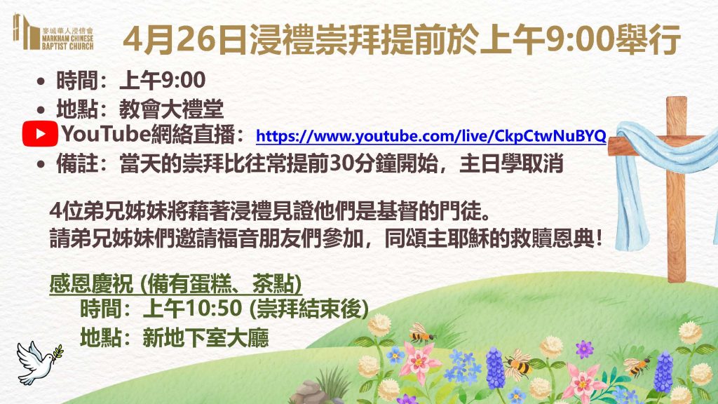 地點:教會大禮堂 (YouTube網絡直播:https://www.youtube.com/live/CkpCtwNuBYQ)